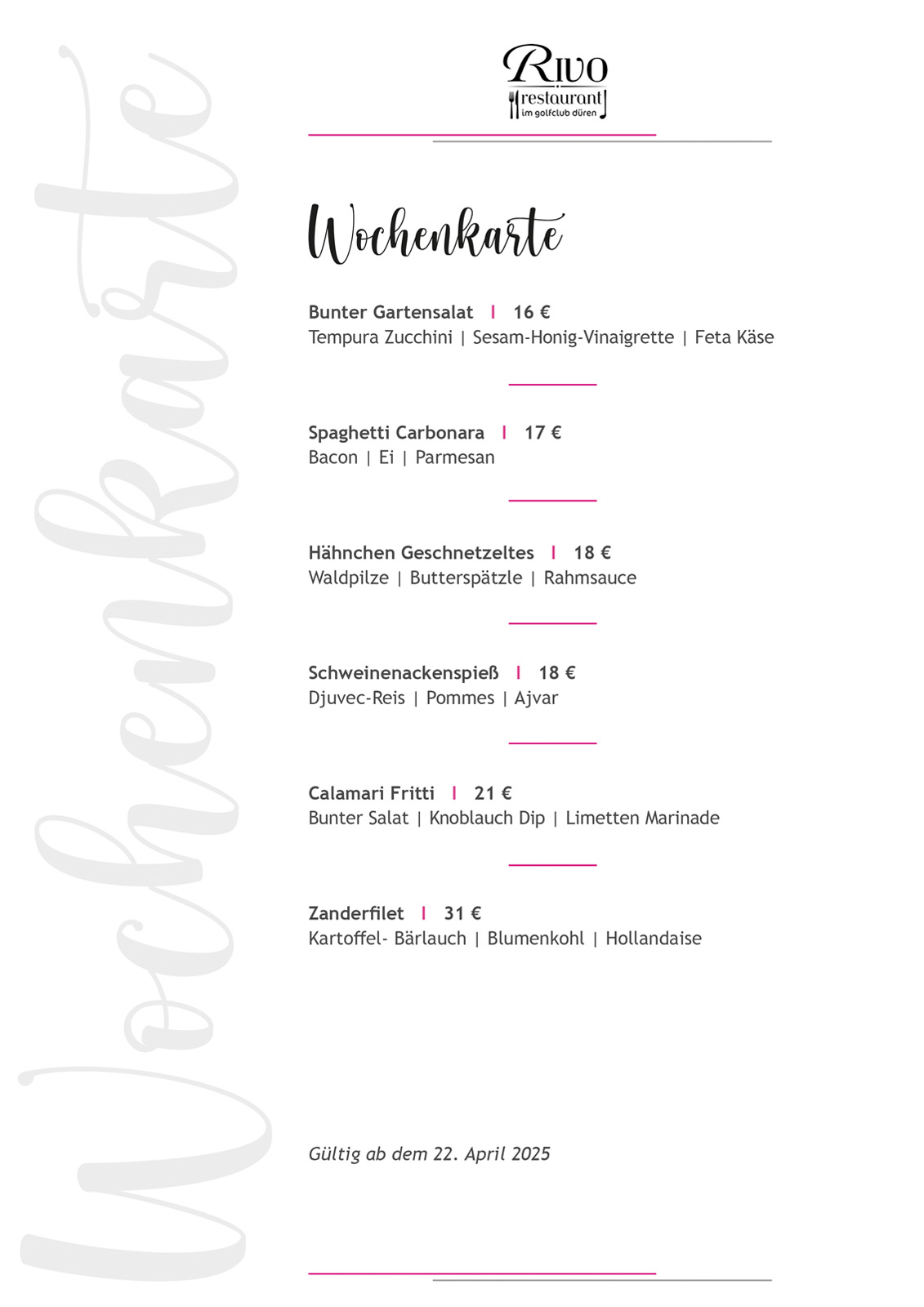 Wochenkarte Hier sehen Sie die Speisekarte mit wöchentlich wechselnden Gerichten. Weitere Köstlichkeiten finden Sie auf unserer Hauptkarte und Monatskarte.